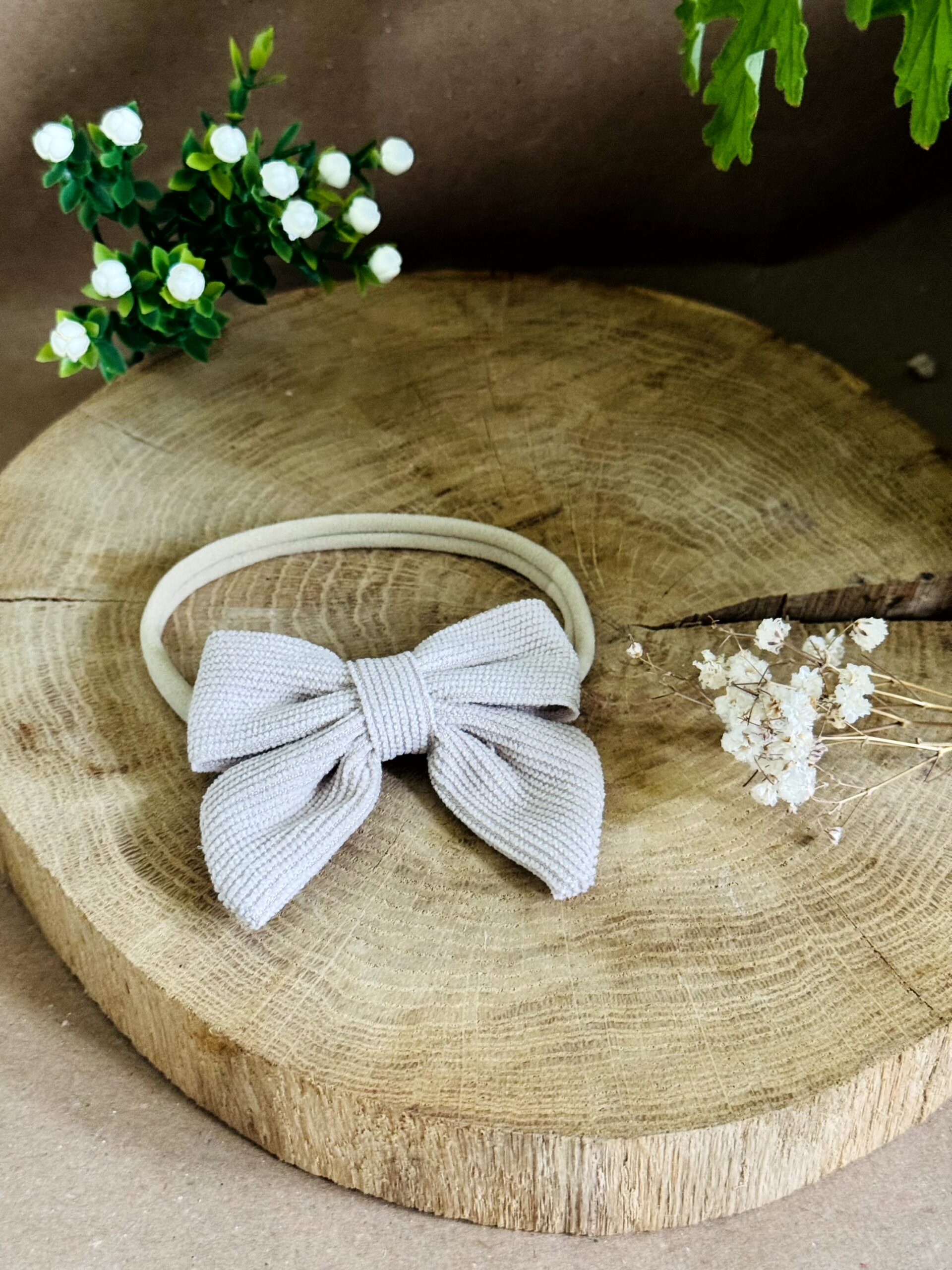 Stylowa opaska bezuciskowa w kolorze beżowym z uroczą kokardką. Idealna od narodzin do ok. 3 lat. Ręcznie wykonana, wygodna i delikatna — na chrzest, roczek, urodziny oraz na co dzień.